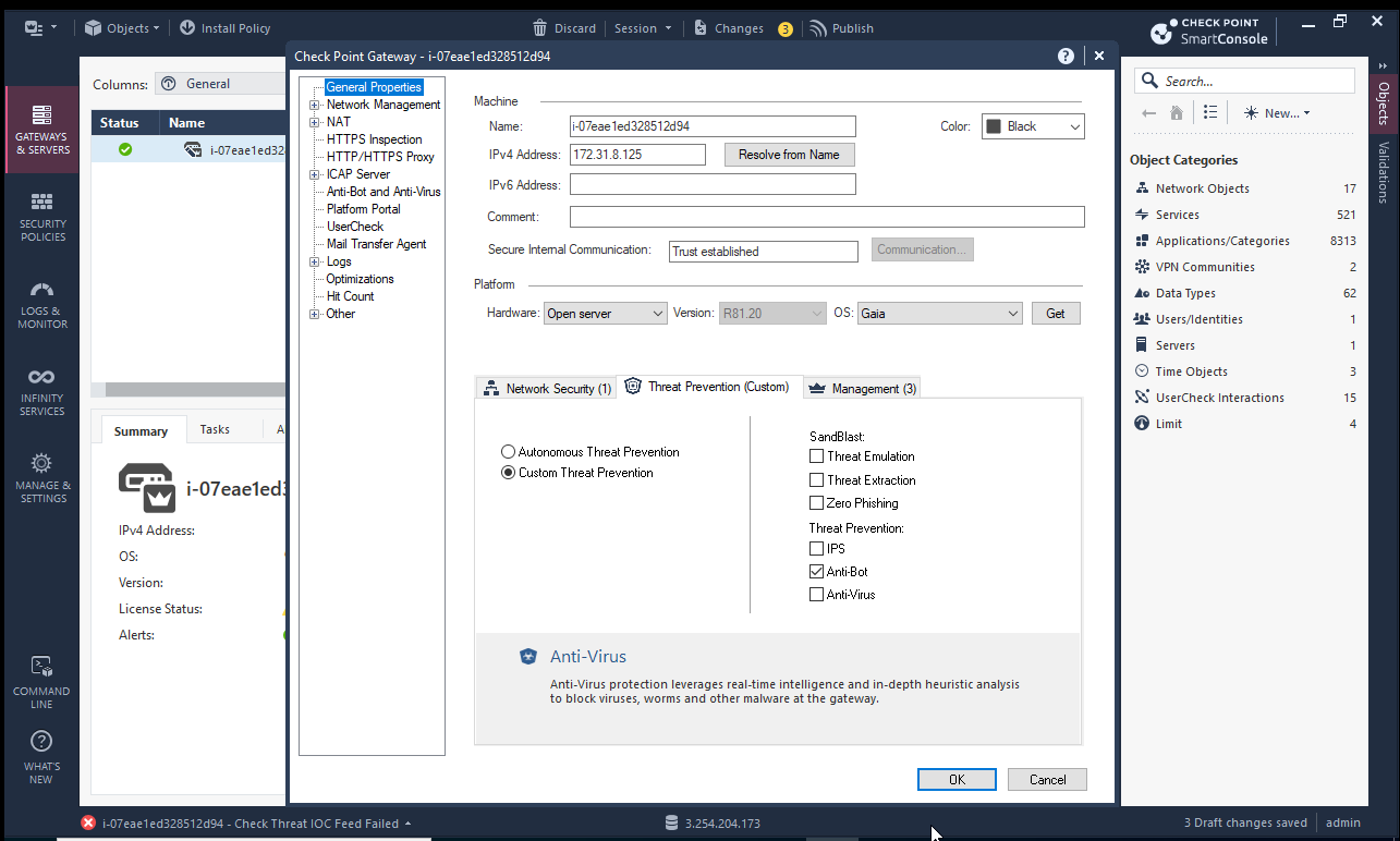You will have this properties menu, select "Threat Prevention (Custom)", then activate at least Anti-Bot or Anti-Virus.